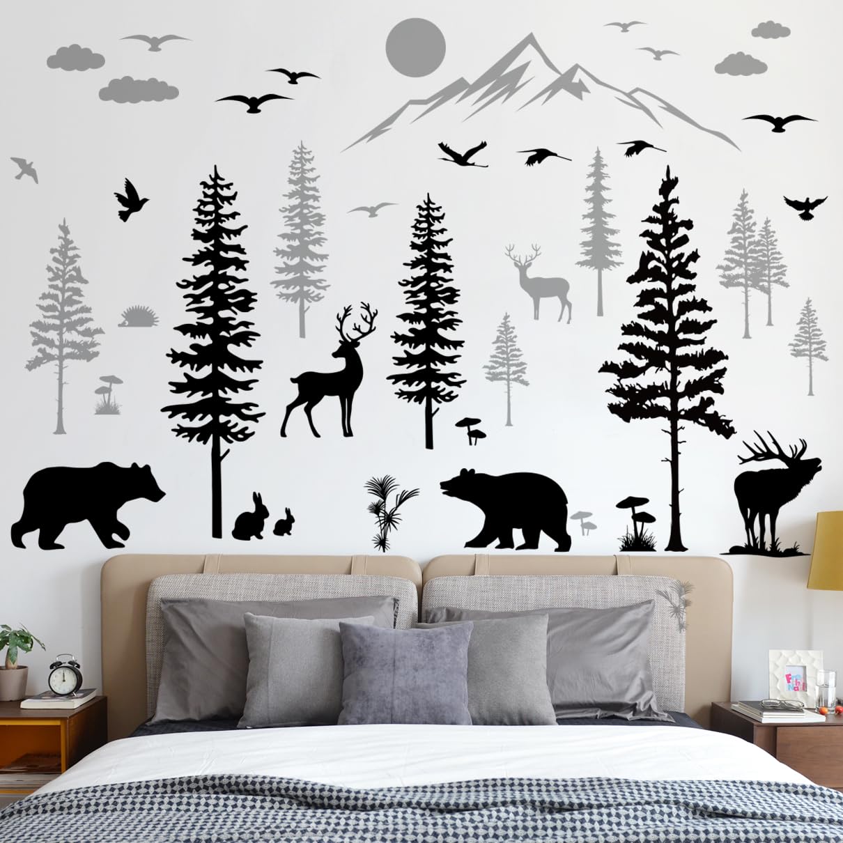 5 Sheets of 12x36inch Large Black and Grey Pine Tree Wall Sticker Peel and Stick Mountain Forest Tree Wall Decal Woodland Deer Bear Birds Wall Decor for Nursery Bedroom Living Room Decoration
