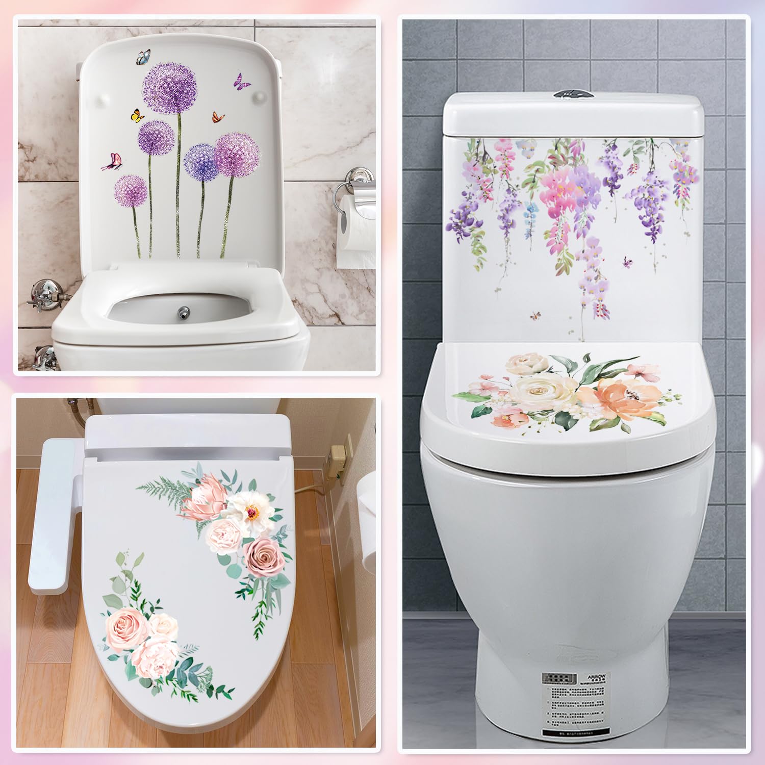 - PACKAGE INCLUDES: The package comes with 4 sheets of toilet seat stickers.You can stick pink purple floral toilet lid decals on both sides of the toilet lid or on the toilet tank, and you will have a unique toilet. This looks great.