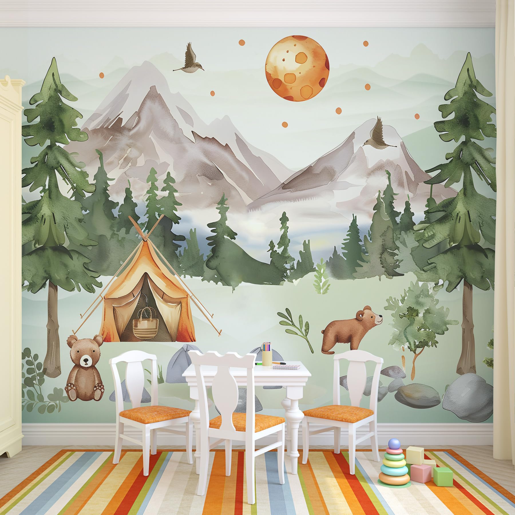 AM AMAONM 63x89.8inch Large Watercolor Mountain Landscape and Forest Pine Tree Wallpaper 3D Peel and Stick Animals Wall Mural Decor Nature Woodland Wallpaper for Nursery Bedroom Living Room Home (A)