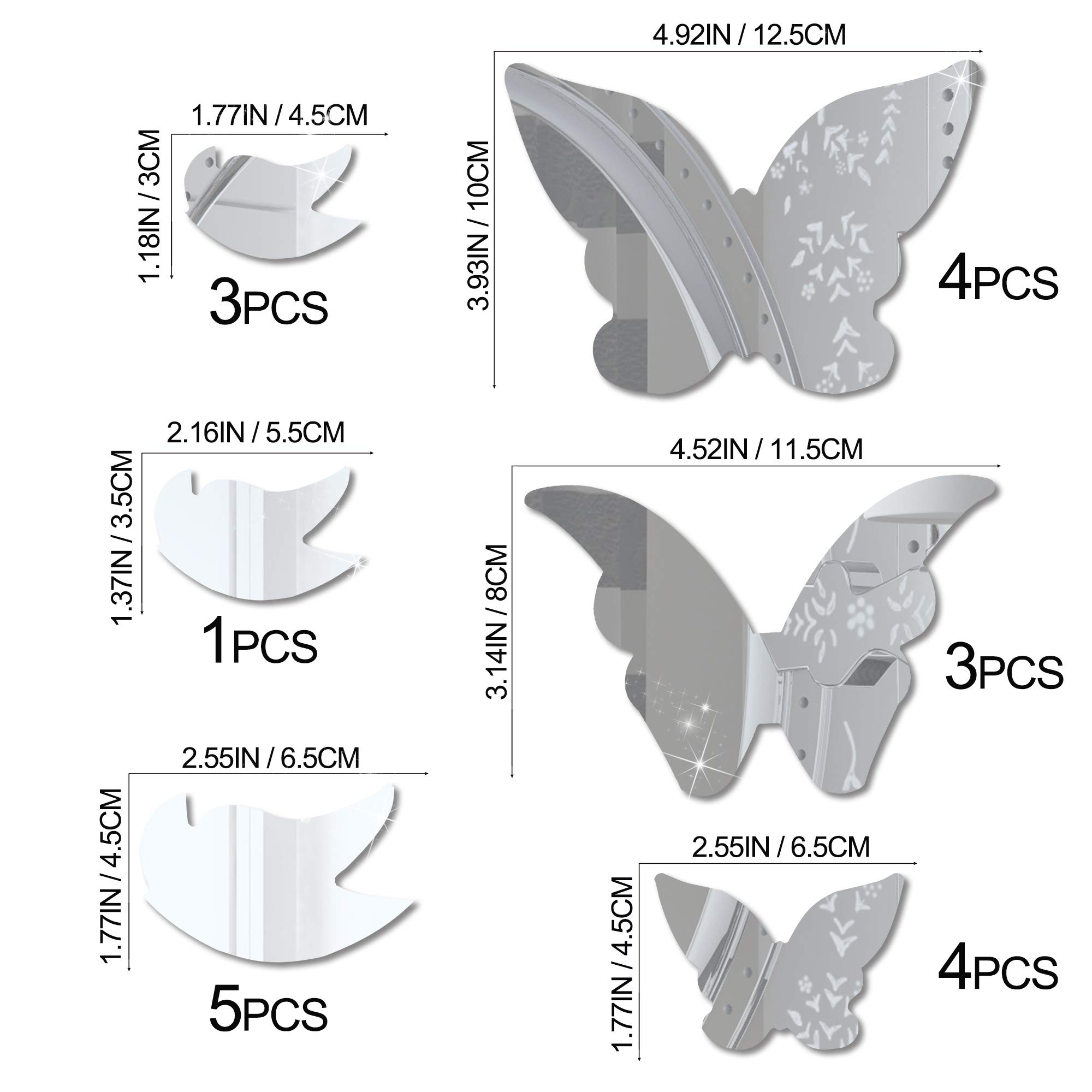 - Ideal Size & Lovely Gift Choice: Comes with 21 pieces butterflies in different sizes, finished display size 23.62"x35.43", enough to decorate a large area. The stylish shiny mirror design makes them a sweet and practical gift for birthdays, baby showers, housewarming, Christmas and festivals, bringing surprise and beauty to kids, girls, family and friends.