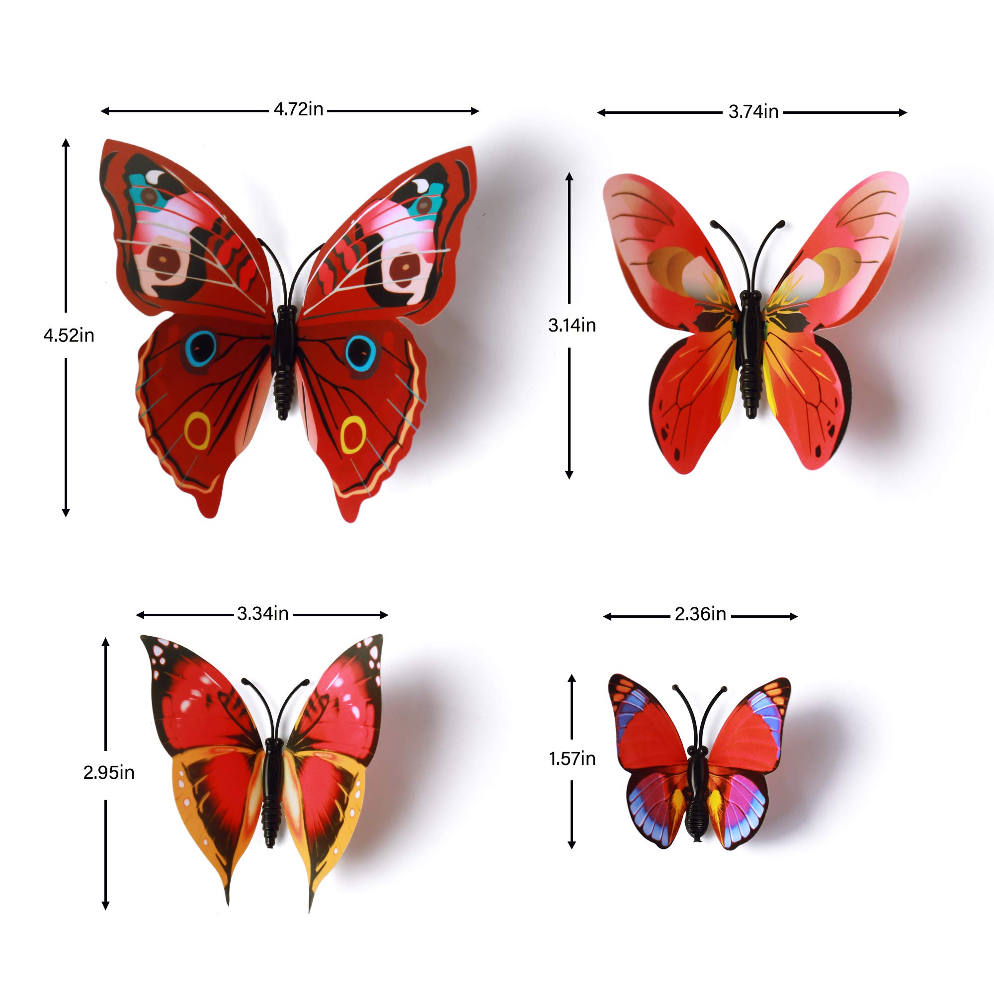 - ă4 Sizes & 6-Color Butterfly Designă: Total 72 pieces butterflies with 4 different sizes: 12cm(4.7in), 10cm(3.9in), 8cm(3.1in), 4cm(1.6in). Including 6 vibrant colors: yellow, green, blue, purple, pink, red, 12 pieces per color. Vivid 3D wing design creates a romantic, lively and dreamy atmosphere for bedroom, TV background and kids room.