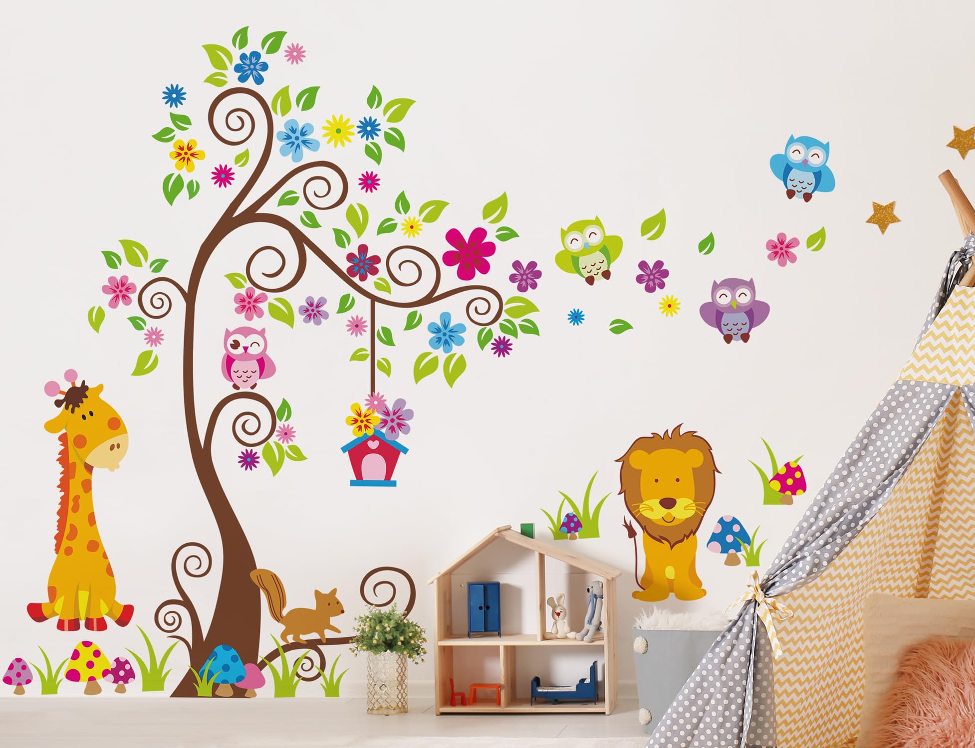 Large Brown Tree with Colorful Flower Green Leaf Wall Decals DIY Cartoon Jungle Animal Lion Giraffe Owl Wall Sticker 3D Peel and Stick Art Decor for Home Nursery Bedroom Decoration